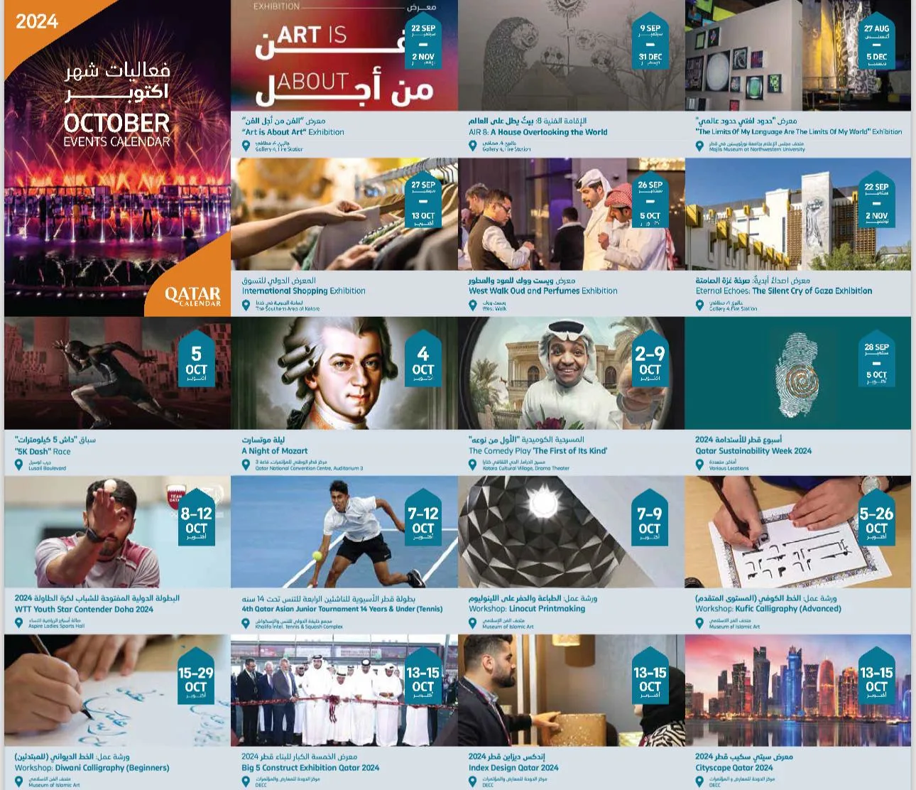 وبهذه المناسبة، قالت الشيخة نور عبدالله آل ثاني، رئيس قسم تنظيم الفعاليات والمهرجانات السياحية في قطر للسياحة: “تعكس رزنامة قطر بشكلها وتصميمها الجديد التزامنا الثابت بأن نضع بين يدي زوار قطر وأهلها مصدراً رئيسياً يغطي كل ما يجري على أرض قطر من فعاليات وأنشطة متنوعة. وسواء كانت فعاليات رياضية حافلة بأجواء حماسية أو ورشات عمل أو أنشطة ترفيهية، فإننا نهدف دائماً إلى الارتقاء بمفهوم تجارب الترفيه في قطر. ولذلك يسعدنا أن نقدم ضمن رزنامة أكتوبر مجموعة من الفعاليات النابضة بالحياة، والتي تشمل سلسلة من المعارض الفنية الرائدة والتجارب الترفيهية، وكذلك عودة أكبر المعارض الدولية للتسوق”.