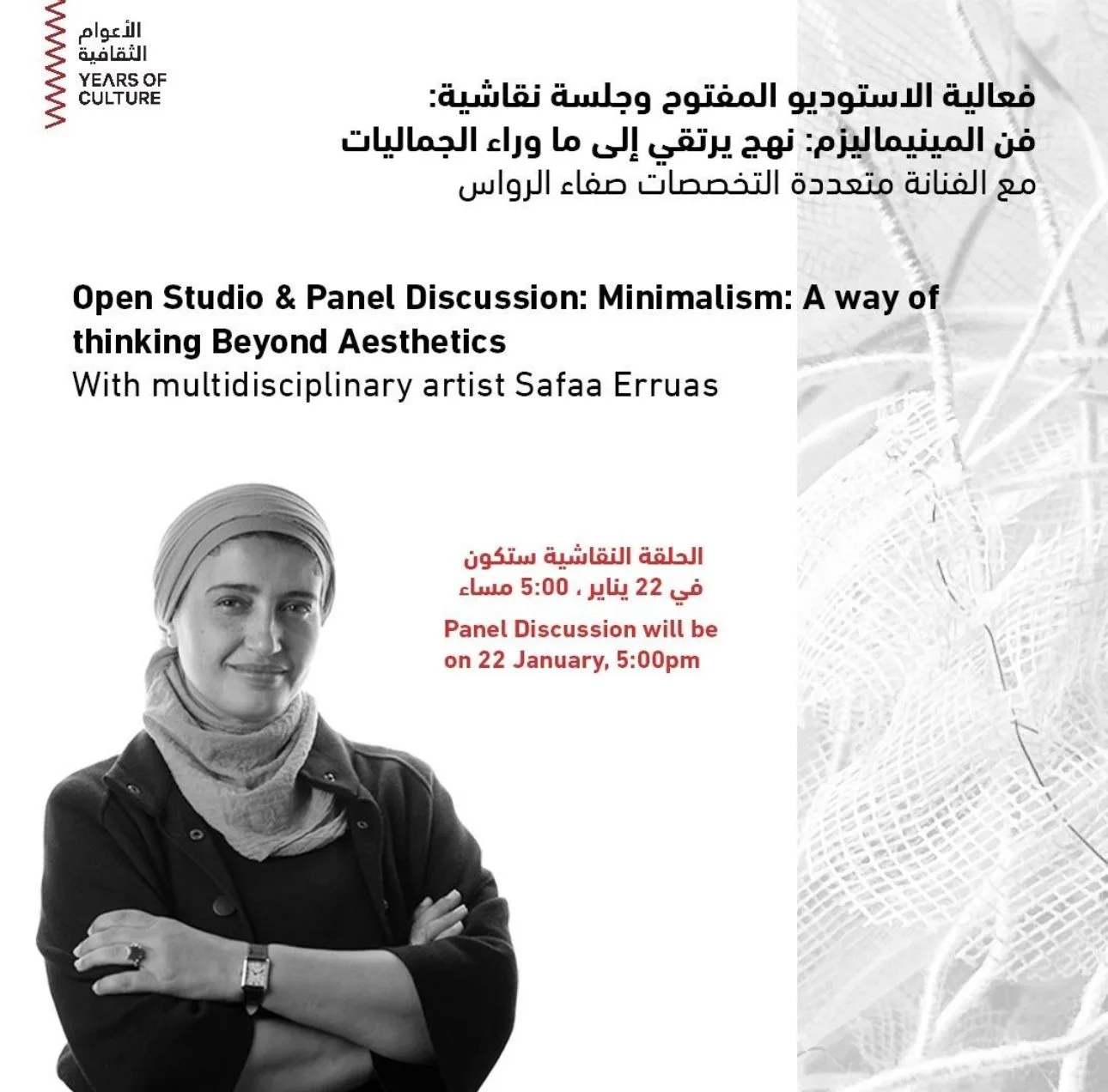 وستُعقد الجلسة النقاشية، التي يديرها الدكتور بهاء الدين أبو دية، قيّم أول للفن المعاصر بمطافئ: مقر الفنانين، يوم 22 يناير في تمام الساعة 5:00 مساءً، وسيكون الاستوديو المفتوح متاحًا من الساعة 4:00 عصرًا إلى 8:00 مساءً، من 22 إلى 24 يناير. وستنعقد كلتا الفعاليتين في مطافئ: مقر الفنانين، في الطابق الأول، استوديو Q2 (ب).