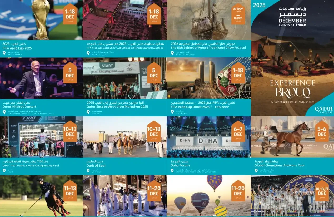 ويتميز شهر ديسمبر بجمعه بين الفعاليات التراثية والرياضية والأنشطة الترفيهية والمجتمعية، بداية من بطولة كأس العرب قطر 2025 ونهائيات بطولة العالم للترايثلون وصولاً إلى الأمسيات الغنائية والموسيقية التي يقدمها نخبة من نجوم الطرب والموسيقى في العالم والمهرجانات التراثية واحتفالات اليوم الوطني لدولة قطر.