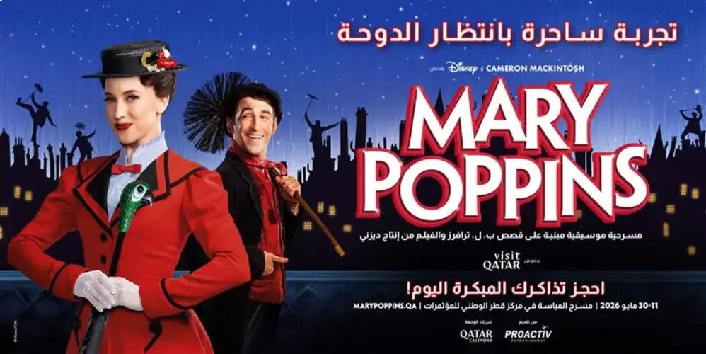 كشفت Visit Qatar عن استضافتها للمرة الأولى في الدوحة العمل الموسيقي العالمي الحائز على الجوائز “ماري بوبينز”، حيث يقدم العرض المسرحي، من إنتاج كاميرون ماكينتوش ومجموعة “ديزني ثياتريكال“، من 11 إلى 30 مايو 2026 على مسرح المياسة في مركز قطر الوطني للمؤتمرات.