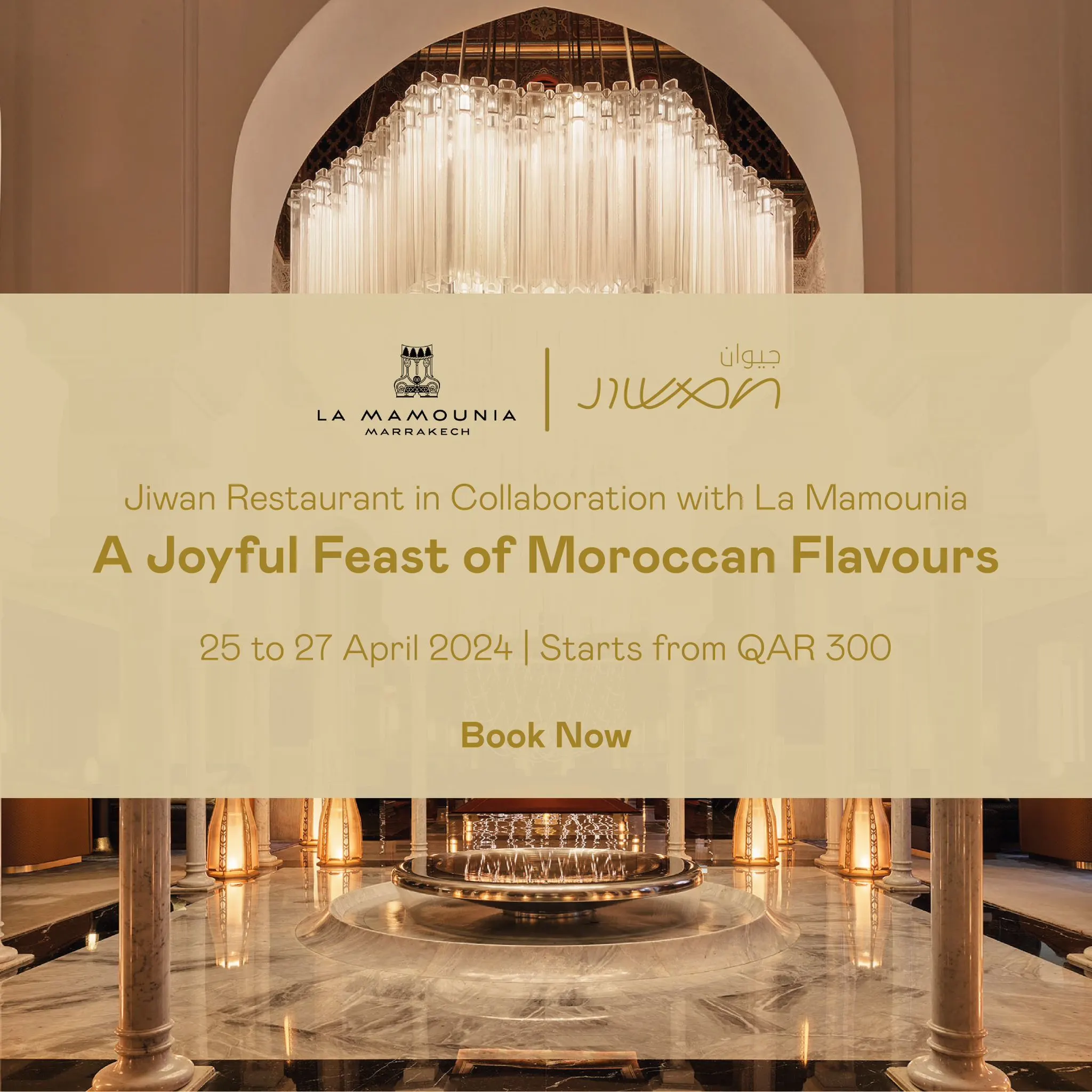 بدءًا من 25 أبريل، سيُرحب مطعم جيوان في متحف قطر الوطني بالمامونية، وهو فندق في المغرب يبلغ عمره قرنًا، وذلك في إطار تعاون يحتفي بالمطبخ المغربي لمدة ثلاثة أيام فقط، حيث يُقدم جيوان قائمة طعام خاصة لوجبتي الغداء والعشاء مستلهَمة من مطعم Le Marocain “المغربي”، أحد المطاعم الأربعة بفندق المامونية العريق، وذلك ضمن فعاليات العام الثقافي قطر-المغرب 2024.