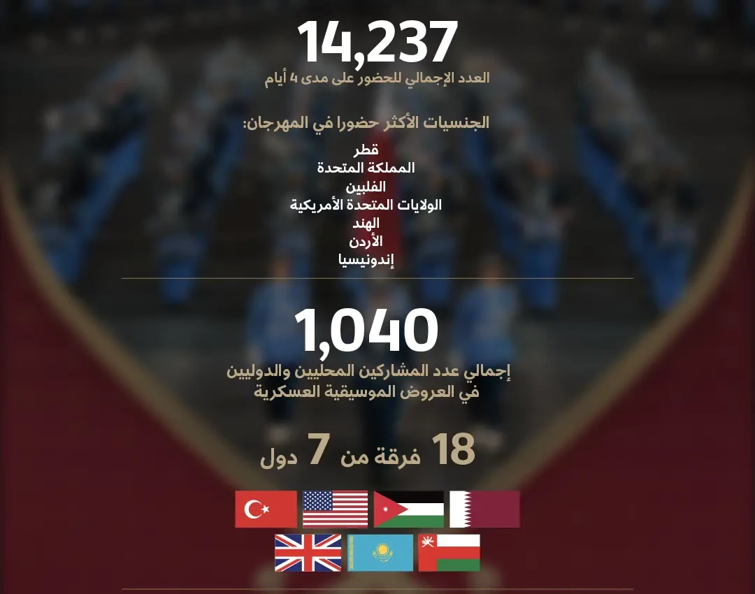 وجاء المهرجان الذي أقيم تحت رعاية سعادة الشيخ خليفة بن حمد بن خليفة آل ثاني، وزير الداخلية وقائد قوة الأمن الداخلي «لخويا»، وبتنظيم من وزارة الداخلية بالتعاون مع Visit Qatar، ليشكل منصة عالمية جمعت بين الموسيقى العسكرية والانضباط الاستعراضي في مشهد فني متكامل.