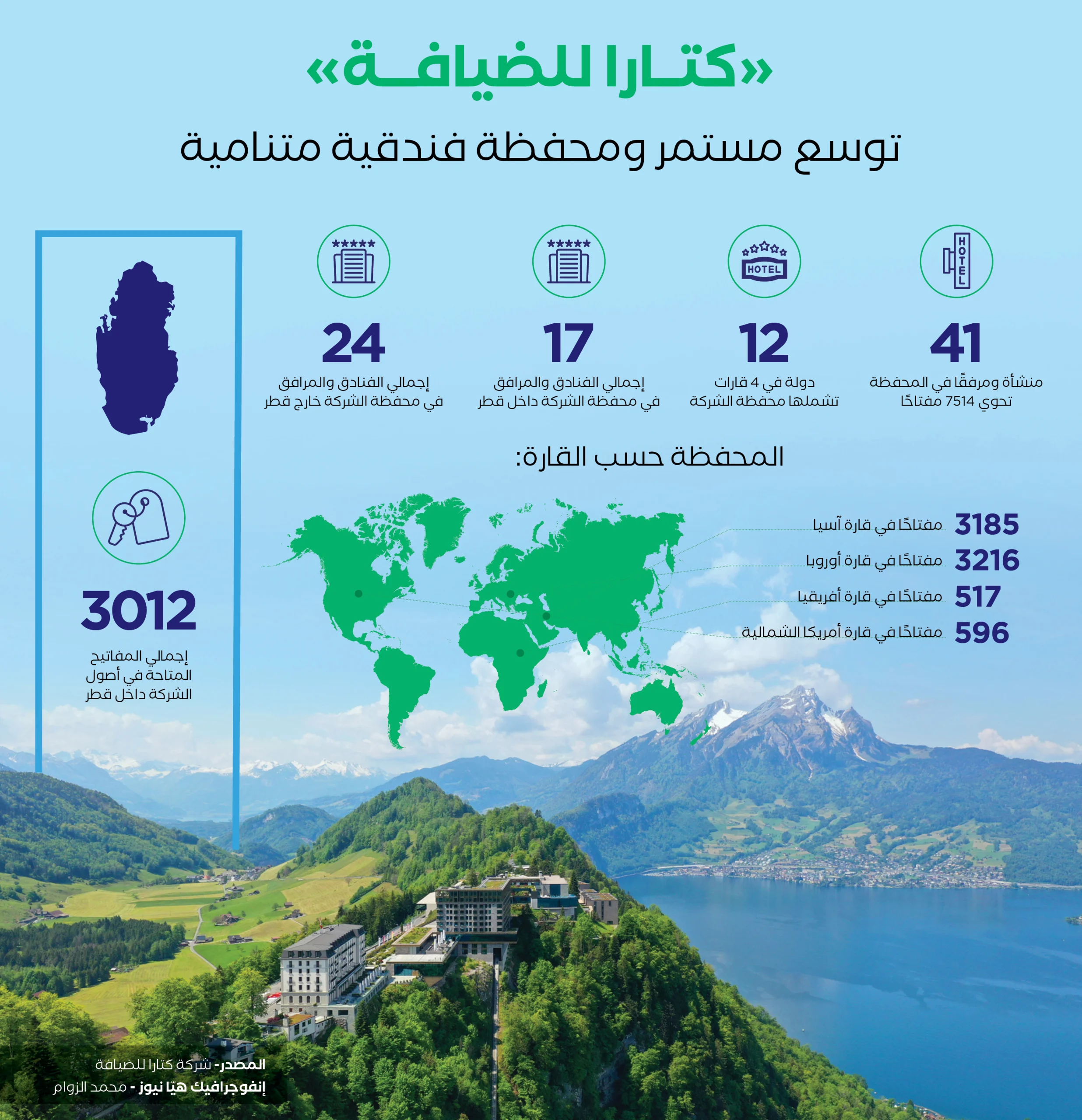ومنذ إنشائها في 1970 وحتى اليوم، تمكَّنَت كتارا للضيافة من امتلاك و/ أو إدارة 41 منشأة فندقية داخل قطر وحول العالم. ومن خلال صروحها ومنشآتها المميزة وسمعتها ومكانتها العالمية، تواصل الشركة مسيرتها التوسعية على الصعيدين المحلي والعالمي، إذ تتطلع الشركة إلى زيادة محفظتها المتنامية.