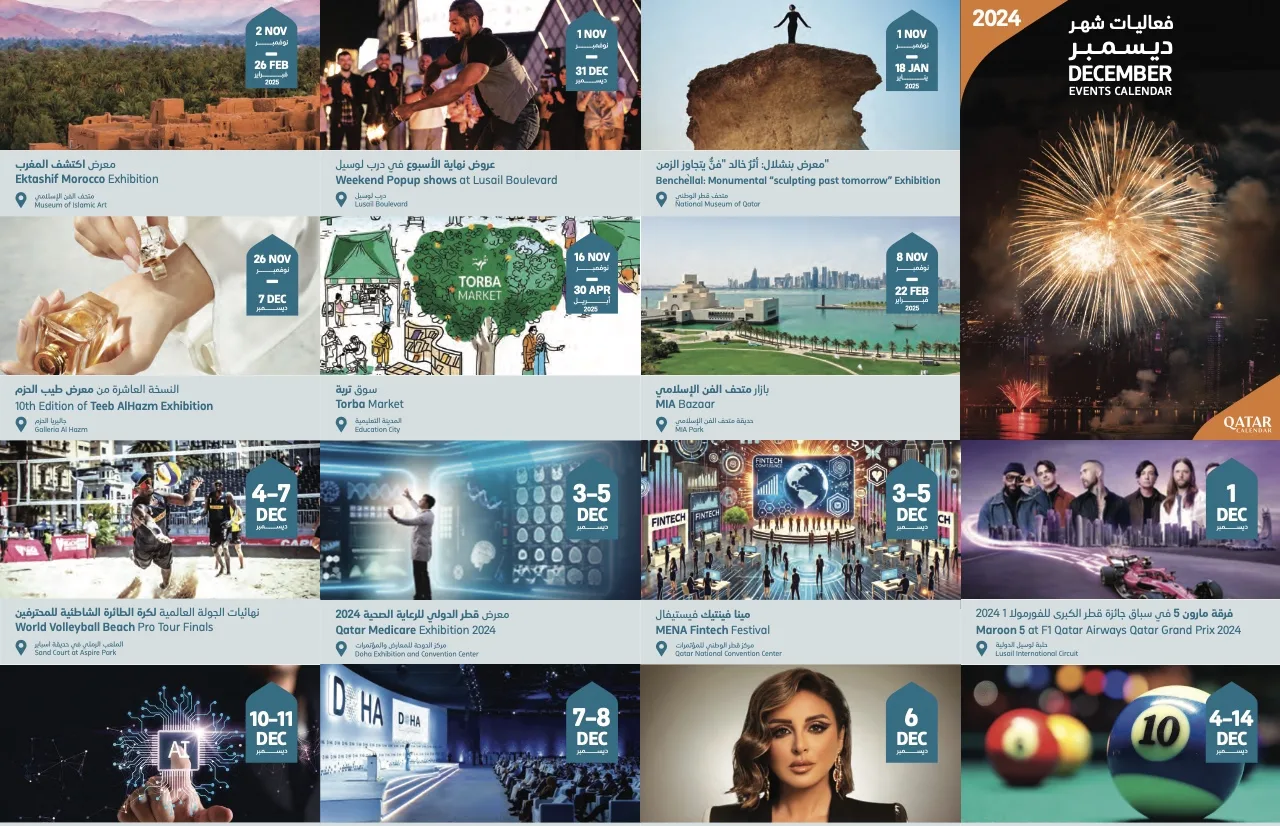 مع حلول شهر ديسمبر، أعلنت قطر للسياحة عن تقديم رزنامة غنية ومتنوعة من الفعاليات الثقافية والرياضية والترفيهية التي تلبي جميع الأذواق والتي تشمل المعارض الفنية العالمية، والعروض الحية المبهرة، والمنافسات الرياضية المشوقة وغيرها.