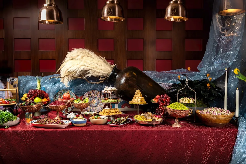 تضم قائمة الطعام المعدة بعناية مجموعة جذابة من الأطباق الفارسية التقليدية، حيث يمكنك بدء رحلتك مع النكهات المميزة لحساء مورغ، بينما يستطيع الذين يبحثون عن المكونات الطازجة الانغماس في تشكيلة السلطات مثل سلطة شيرازي وبوراني إسفيناج، والاستمتاع بطبق كشك بادمجان المميز، طبق الباذنجان الشهي حيث تذوب كل لقمة في فمك. وبعد ذلك، يمكن للضيف الاستمتاع بالطعم الشهي للمشاوي المشكلة، والتي تضم كبوب كوبيدة، وكوبيده مورقة بالإضافة إلى اليخنات الفارسية التقليدية بينما تنغمس براعم التذوق في تجربة طعام عطرية مع أطباق خورشت قورمة وغالية ماهي، فضلًا عن مجموعتنا المميزة من الحلويات.