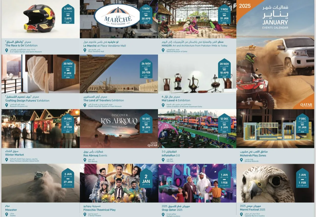 استهلت Visit Qatar العام بمجموعة متنوعة من الأنشطة والتجارب المتنوعة التي تشمل فعاليات اقتصادية وترفيهية وثقافية ورياضية. حيث انطلق شهر يناير بمهرجان قطر للتسوق 2025، والذي يتواصل حتى 1 فبراير، ويتميز المهرجان بالخصومات وعروض الترفيه اليومية وفرص الفوز بجوائز كبرى.