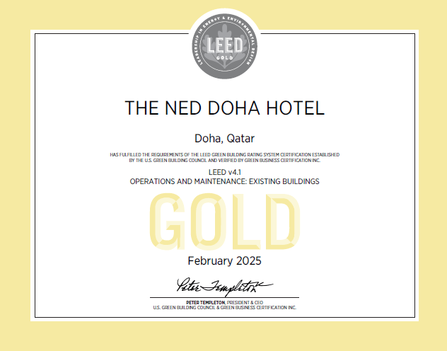 نال فندق ذا نيد الدوحة شهادة ليد LEED الذهبية المرموقة التي تعتبر أعلى شهادة تمنح ضمن برنامج الريادة في الطاقة والتصميم البيئي للمباني القائمة، عن فئة التشغيل والصيانة (O+M).