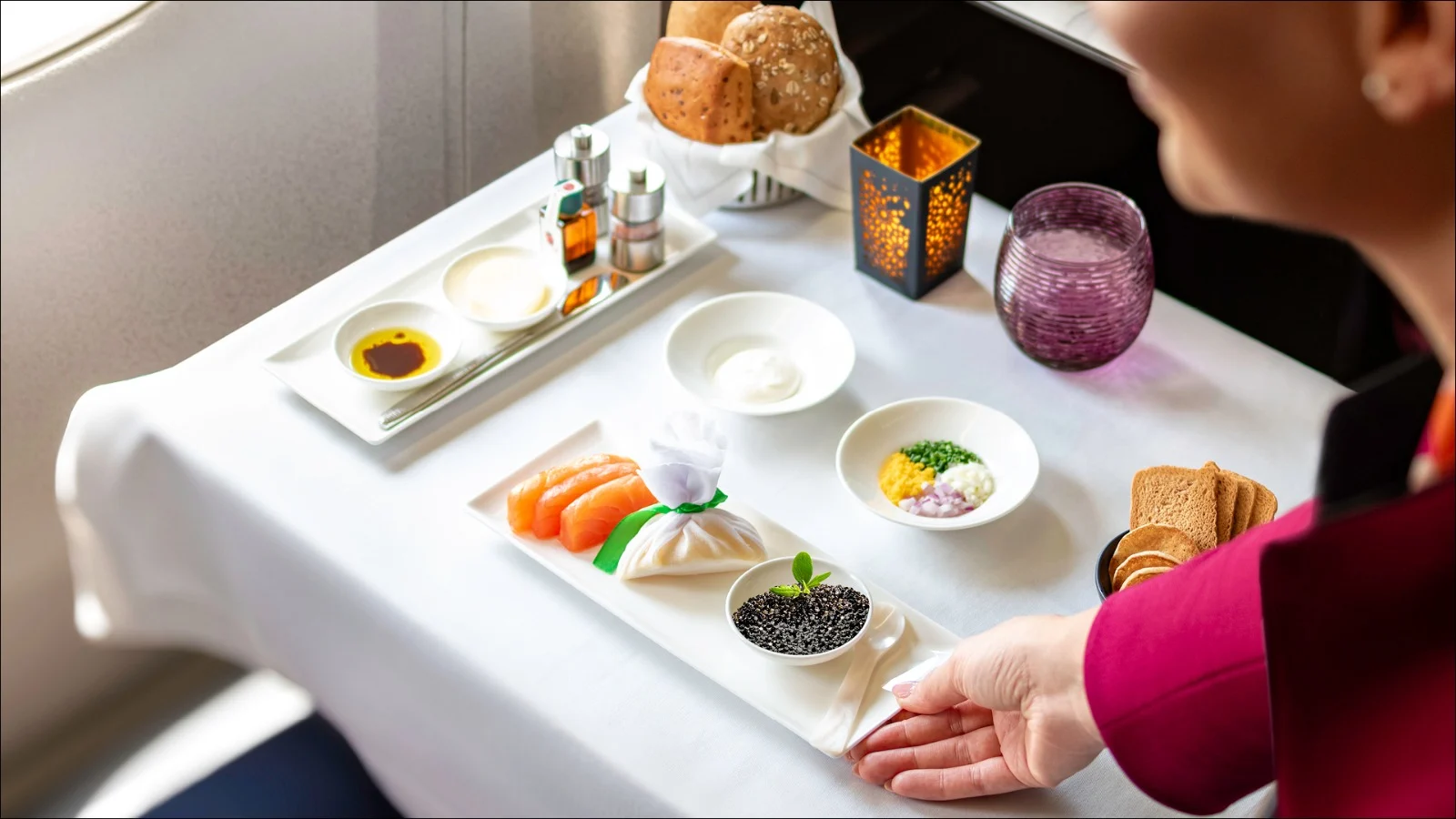 ويمكن للمسافرين أيضاً الاستمتاع بتذوق الكافيار كوجبة مستقلة أو كجزء من الوجبات الشهية المتنوعة والمتوفرة على متن الرحلة.