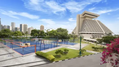 يعتبر منتجع ومركز اجتماعات شيراتون جراند الدوحة أحد المعالم الشهيرة في المدينة، حيث يشتهر الفندق بهندسته المعمارية الهرمية المميزة وموقعه المتميز على طول الخليج العربي، فضلًا عن جمعه بين التراث القطري والرقي الحديث.