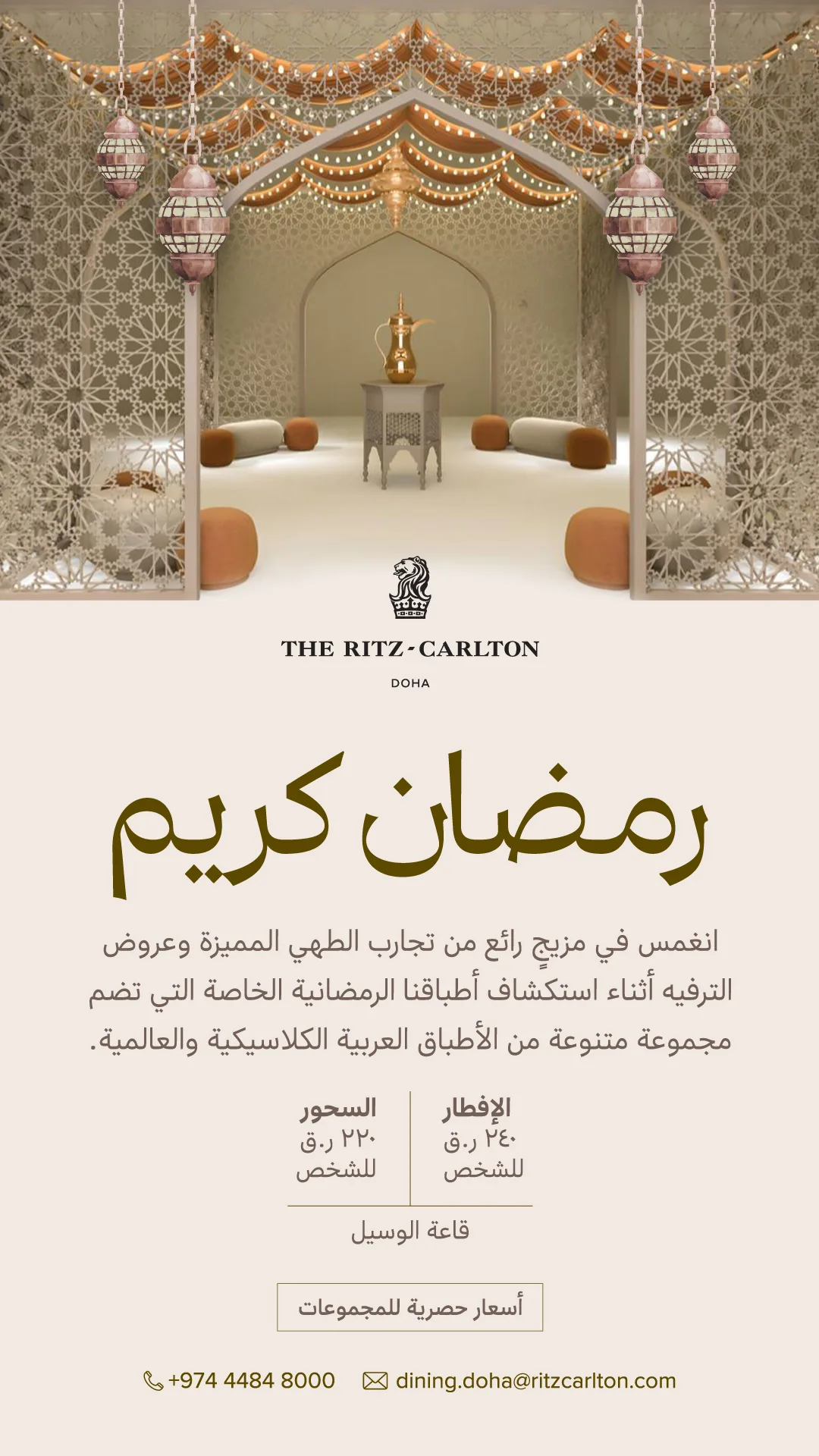 وباعتباره الوجهة الأولى لتناول الطعام في قطر، يعتبر فندق ريتز كارلتون، الدوحة المكان المثالي للاحتفال بهذا الوقت الساحر من العام، حيث يقدم بوفيه الإفطار طوال الشهر الفضيل بسعر يبدأ من 240 ريالا قطريا للشخص البالغ والسحور بسعر يبدأ من 220 ريال قطري، مع توفر أسعار حصرية للمجموعات.