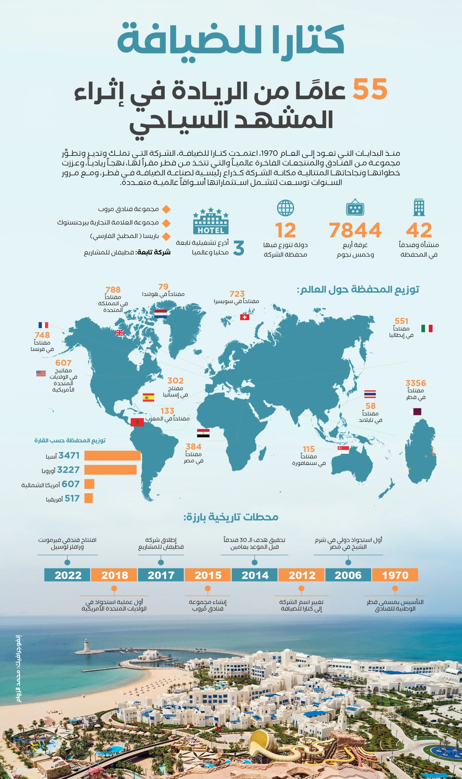 اليوم، وبعد مرور نحو 55 عاماً على انطلاق عملياتها التشغيلية، تمتلك و/أو تدير كتارا للضيافة نحو 7844 غرفة من فئتي الأربع والخمس نجوم، منتشرة في أربع قارات وموزعة على 12 دولة هي: قطر، مصر، المغرب، المملكة المتحدة، فرنسا، إيطاليا، إسبانيا، سويسرا، هولندا، سنغافورة، تايلاند، بالإضافة إلى الولايات المتحدة الأمريكية. ويأتي هذا التوسع انسجاماً مع رؤية قطر ٢٠٣٠ التي تضع الاستثمار العالمي في صميم التنمية الاقتصادية والاجتماعية.